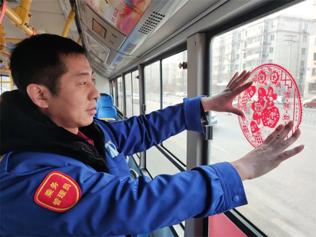 大年三十,堅守崗位的駕駛員給公交車窗貼上“?!弊郑贾霉?jié)日飾品,讓節(jié)日期間乘坐公交車出行的市民感受到新春的氣氛。