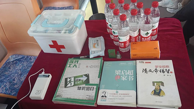車身懸掛著“以夢為馬,不負韶華,中考砥礪前行”“九年寒窗,在此一搏,沖刺中考,奮斗今朝”等祝福條幅,車廂內(nèi),飲用水、充電寶、文具、應(yīng)急藥物、雨傘、紙巾以及書籍應(yīng)有盡有。不一會兒,車內(nèi)就坐了不少家長,對此,家長們很是感動,感謝車隊和王師傅提供的休息場所。