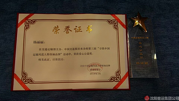3月23日,第三屆“尋找中國(guó)運(yùn)輸風(fēng)范人物領(lǐng)袖品牌”活動(dòng)在北京國(guó)家交通運(yùn)輸部揭曉最終評(píng)選結(jié)果,來(lái)自沈陽(yáng)客運(yùn)集團(tuán)有限公司黃河公共汽車分公司的210路駕駛員,沈陽(yáng)市勞動(dòng)模范楊麗麗同志榮獲“中國(guó)運(yùn)輸風(fēng)范人物愛(ài)心公益” 獎(jiǎng)項(xiàng),為沈城公交行業(yè)爭(zhēng)得了榮譽(yù)。