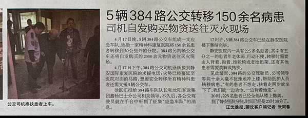 在預(yù)備車(chē)輛前往集結(jié)地點(diǎn)的途中,鑫暢公司384路車(chē)隊(duì)徐躍接到了位于線(xiàn)路附近沈陽(yáng)靜安國(guó)際心理康復(fù)中心的求助電話(huà),那里有醫(yī)患人員近160余人需要緊急撤離。集團(tuán)公司臨時(shí)指揮部立即下達(dá)384路車(chē)隊(duì)就地組織執(zhí)行疏散命令。384路車(chē)隊(duì)根據(jù)現(xiàn)場(chǎng)情況,留下五輛車(chē)執(zhí)行撤離輸送任務(wù),另外兩輛車(chē)前往集結(jié)點(diǎn)待命。
