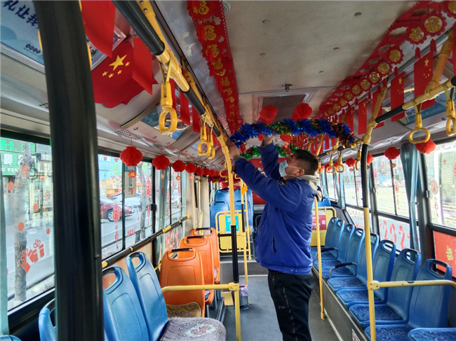 在共產(chǎn)黨員先鋒崗丁亞南駕駛的車(chē)上,紅色紙燈籠、藍(lán)色綠色拉花、福字串、窗貼,寫(xiě)著牛年大吉的彩板畫(huà)一應(yīng)俱全,節(jié)日氣氛十分濃厚,車(chē)廂里不時(shí)傳來(lái)乘客們的贊揚(yáng)聲和感謝聲。提到裝扮車(chē)廂的初衷,他表示:“這不是疫情嘛,疫情本來(lái)大伙心情都比較沉重,我就弄了點(diǎn)兒新年的氣氛,讓大家放松放松心情。我是一名共產(chǎn)黨員,為乘客服好務(wù)是我的宗旨,疫情期間,更需要我們沖鋒在前,迎難而上,為大家樹(shù)立好黨員的形象。”